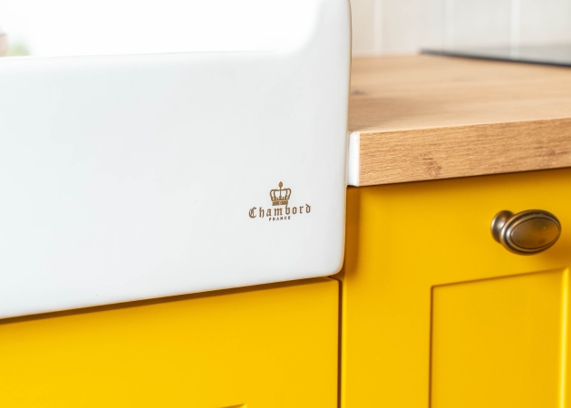 - façades à cadre laquées jaune curry, emblématiques du style campagne chic,