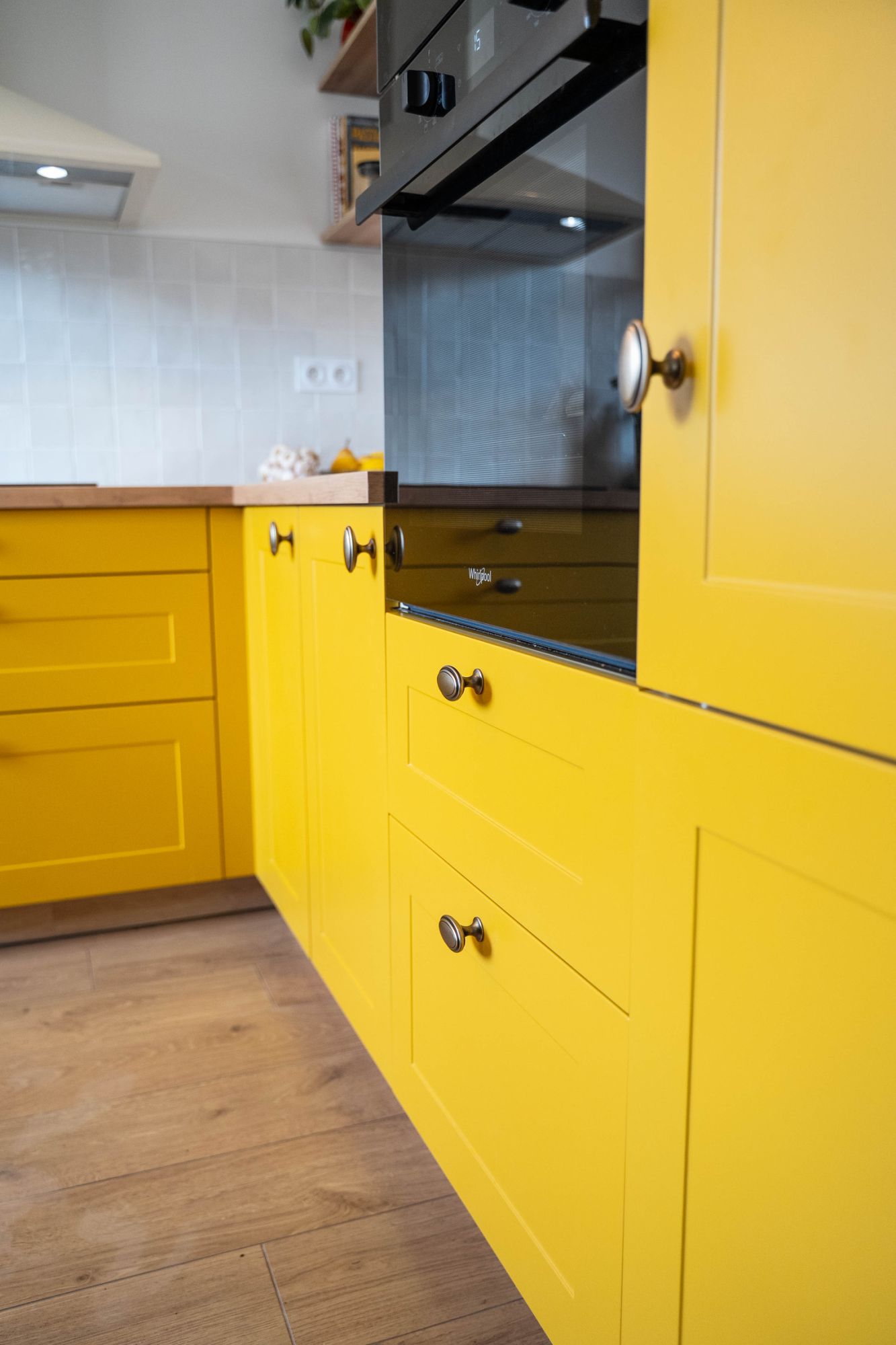 La cliente souhaitait absolument une cuisine jaune curry, une teinte forte et chaleureuse autour de laquelle l’ensemble du projet a été conçu. Ce choix audacieux permettait d’apporter de la lumière et du caractère à la pièce, tout en affirmant un style unique.